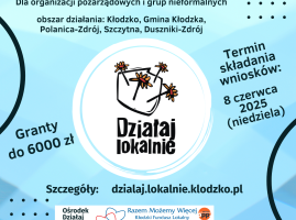 Do 8 czerwca 2025 r. do godz 23.59 można składać wnioski w Konkursie Grantowym Działąj Lokalnie 2024. Możne pozyskać granty w wysokości do 6.000 zł na działania realizowane w okresie 3-6 miesięcy. Wnioski mogą...